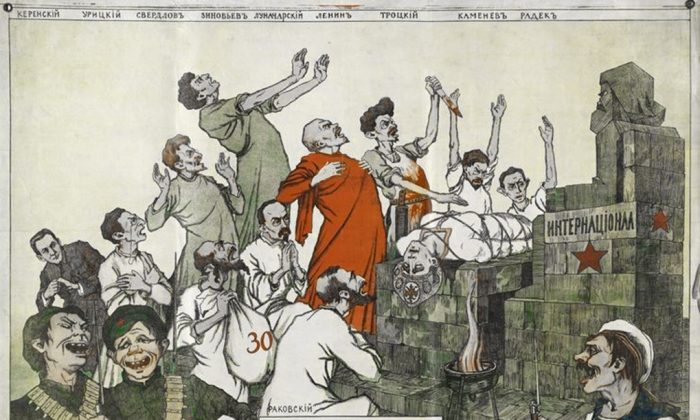 La ilustración que está en el encabezado de este artículo corresponde a un póster de propaganda rusa del movimiento blanco antibolchevique de 1919, muestra a los líderes comunistas Lenin, Trotsky, Kamenev, Radek, Sverdlov y Zinoviev sacrificando a un personaje alegórico que representa a Rusia a una estatua de Karl Marx.