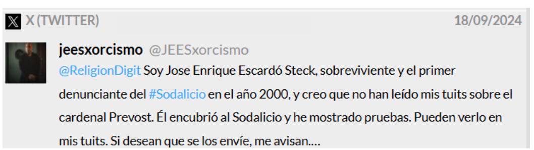 Hace unos días, Escardó compartió con entusiasmo su encuentro con el entonces cardenal Robert Prevost, ahora Papa León XIV, destacando su apoyo a la lucha contra los abusos eclesiales y celebrando su elección como Sumo Pontífice. En redes sociales, se mostró emocionado, afirmando que “mi candidato salió elegido papa” y revelando que incluso intercambiaron mensajes personales, lo que refuerza su imagen de aliado cercano al nuevo pontífice. Este giro contrasta radicalmente con las acusaciones previas que, Escardó ha eliminado de su cuenta de X. Estas publicaciones, de las cuales compartimos capturas de pantalla, lo mostraban acusando a Prevost de encubrir abusos, una postura que ahora parece haber sido convenientemente borrada para proyectar una relación amigable y colaborativa.